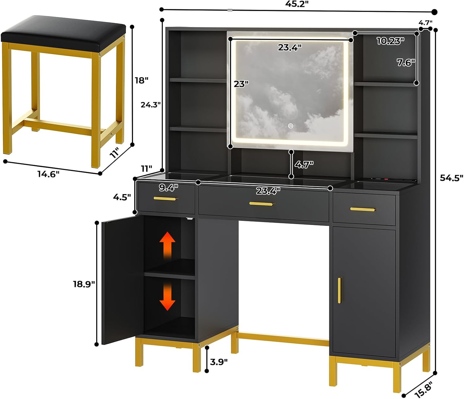 【Ample Storage Space】Dressing Table Overall Dimensions: 45.2″W * 15.8″D * 54.5″H. Equipped with a spacious glass top, 3 drawers, 2 side cabinets, 6 open shelves and a storage area hidden behind the mirror. The drawers have compartment organizers for classified storage. Side cabinets have adjustable dividers for flexible storage. Featuring great storage, this vanity desk with mirror and lights makes it easy to keep everything organized and within reach, giving you a clutter-free desktop.