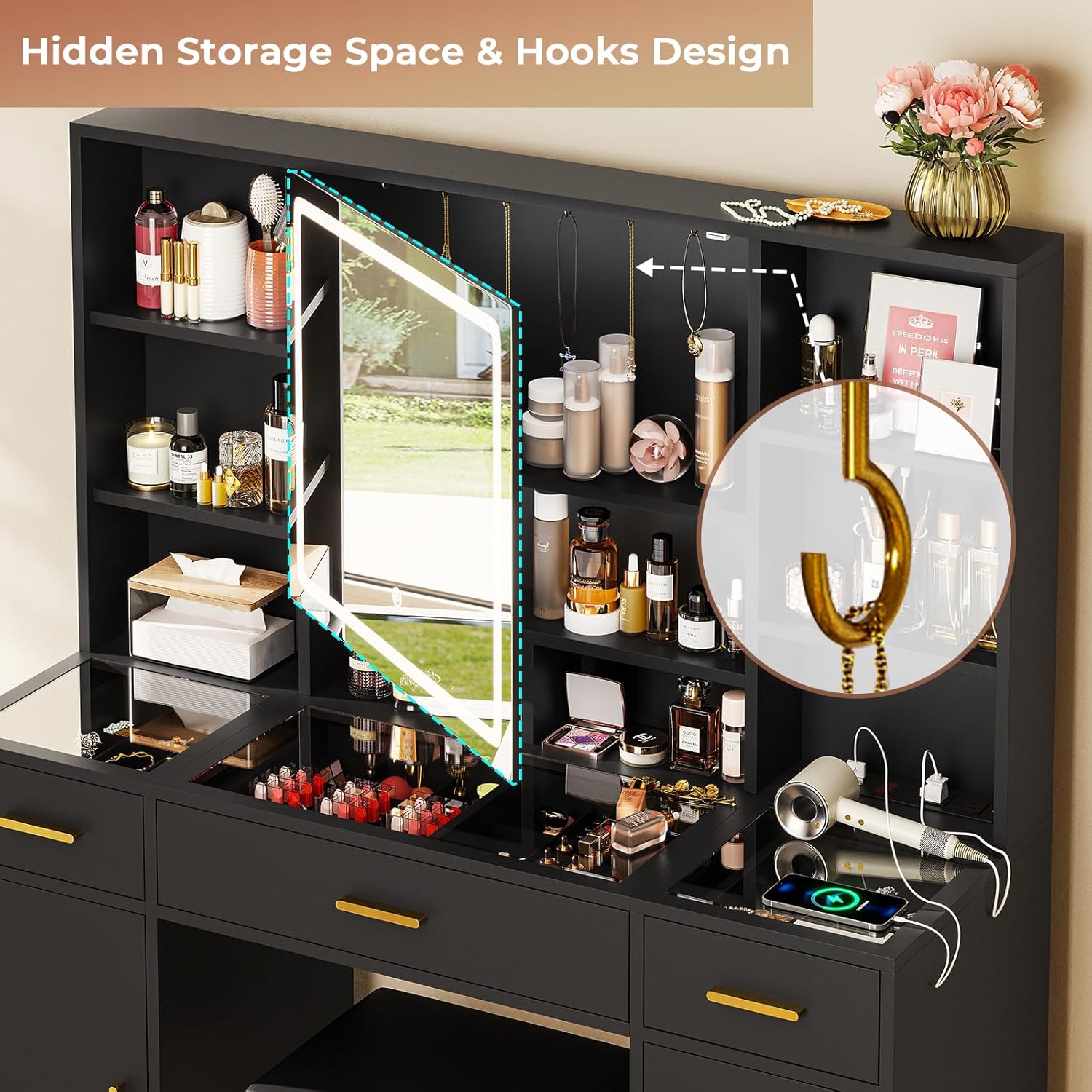 【Hidden Storage Space & Hook Design】There is a hidden storage shelf behind the mirror of the makeup vanity with lights, which is used as a private storage space to store relatively high skin care products, perfume bottles, or your personal items. The top hooks can hang necklaces, bracelets, and more for easy access and less clutter. The mirror size of the makeup table is: 23.4″W × 23″H