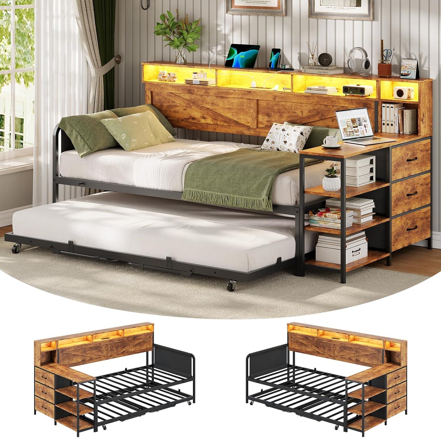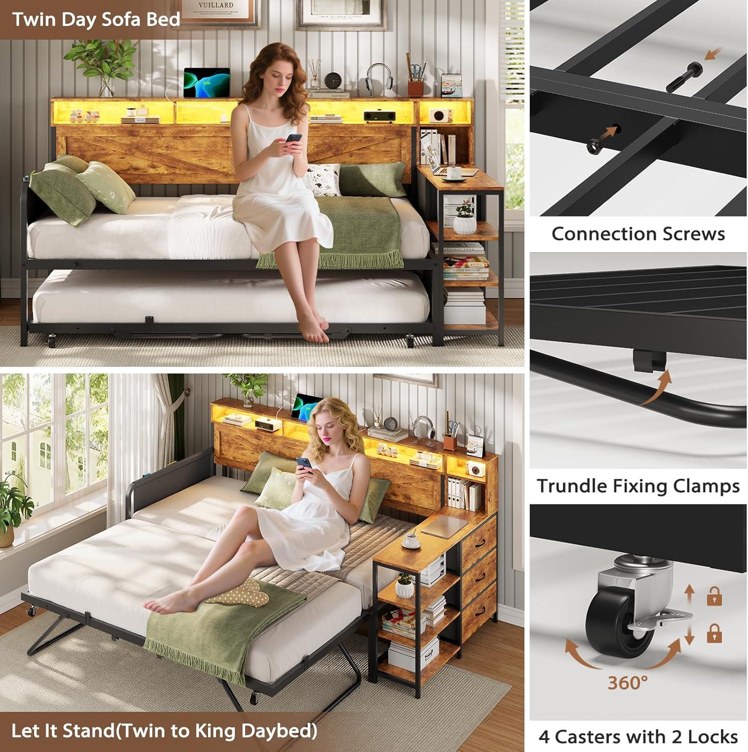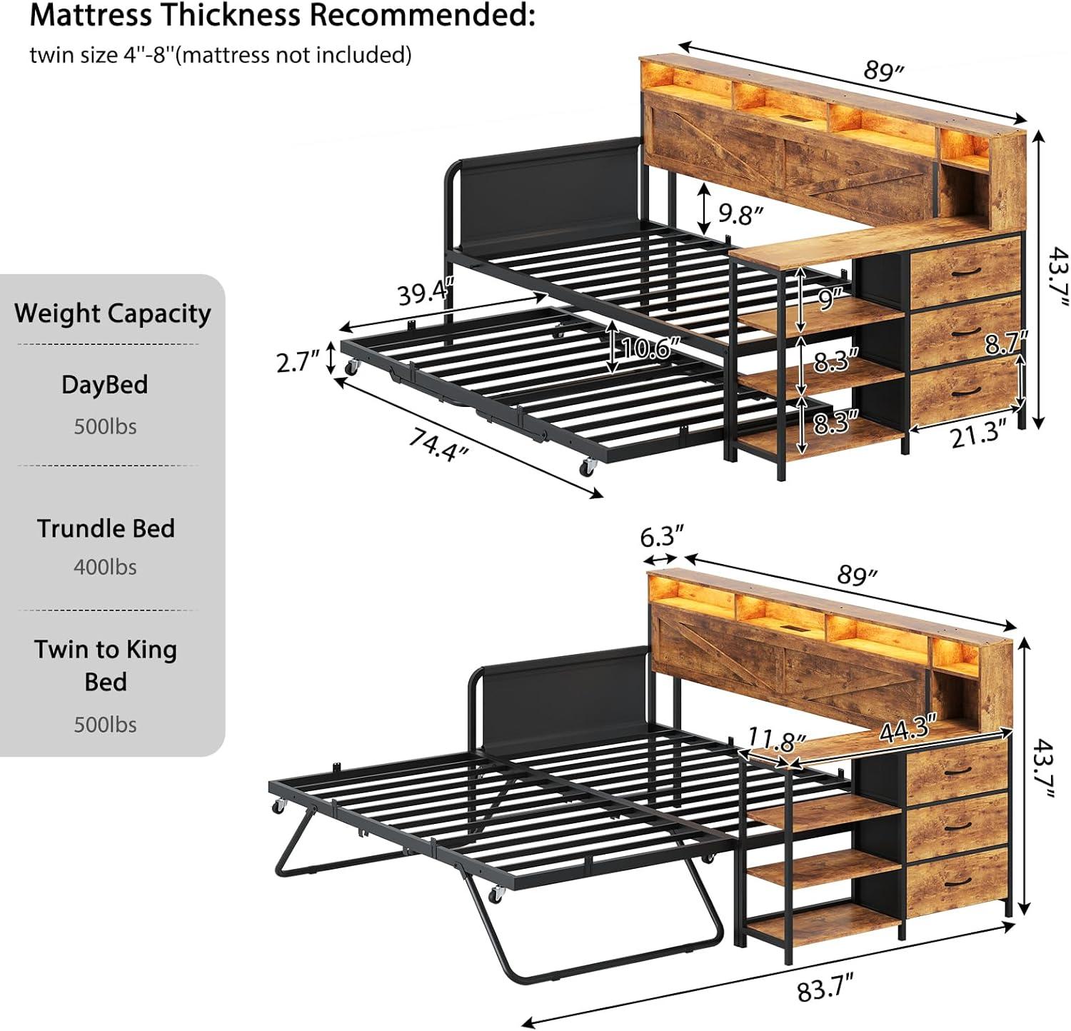 VIAGDO Daybed Twin with Pop Up Trundle, Farmhouse Wooden Day Bed Frame with 3 Storage Drawers and Shelves, Twin to King Daybed with Charging Station and LED Lights for Bedroom, Rustic Brown(Rustic Brown)