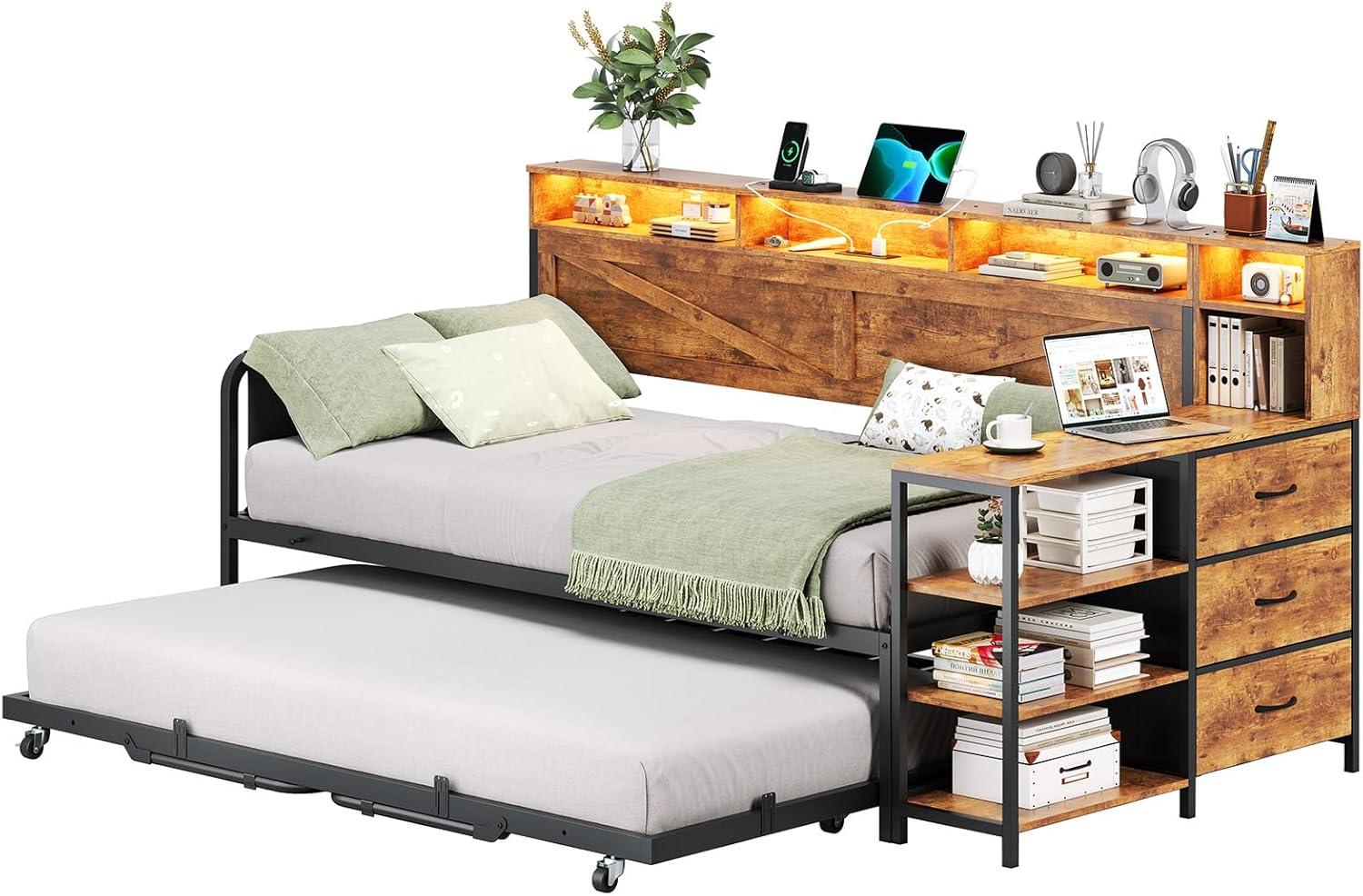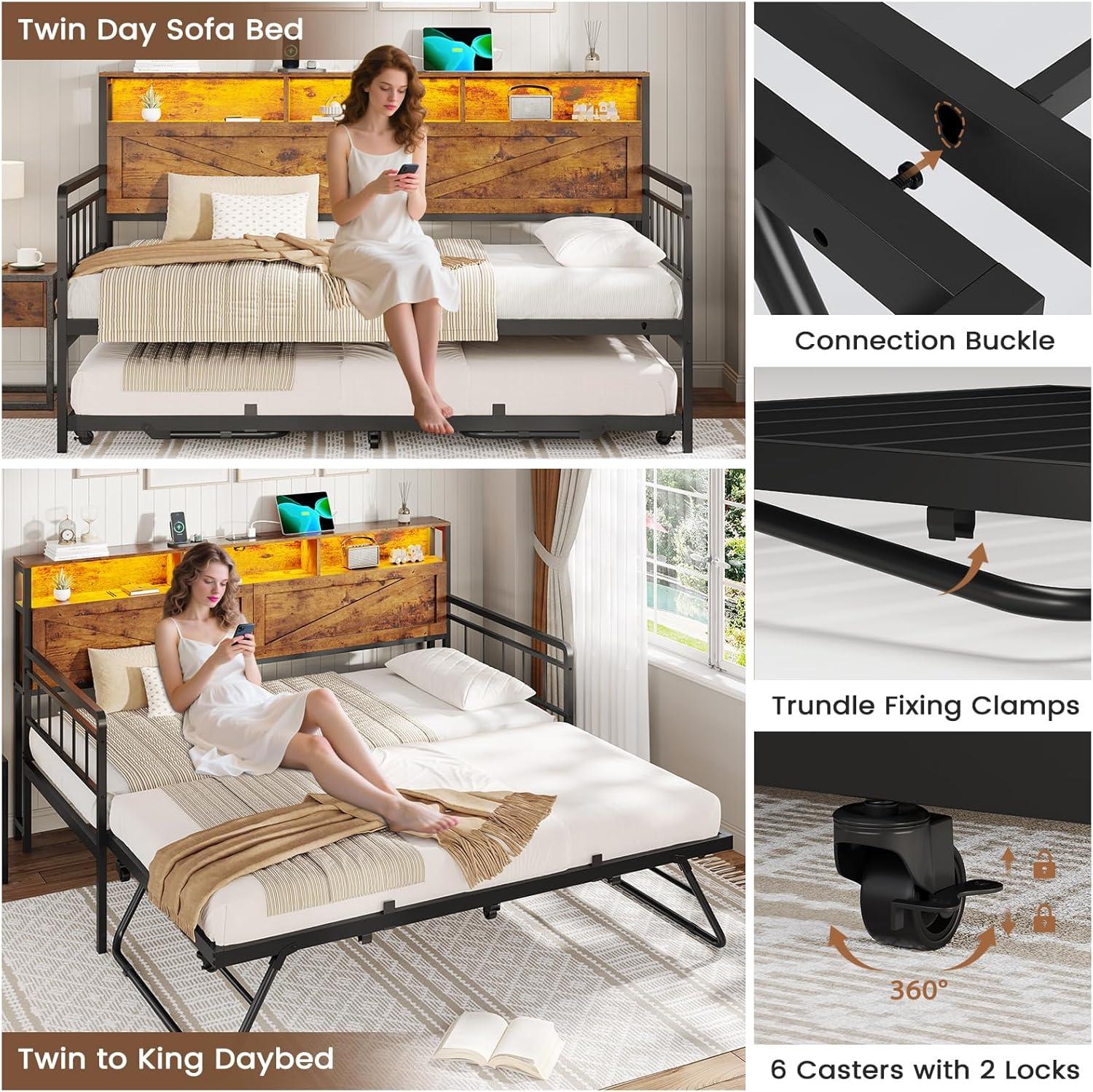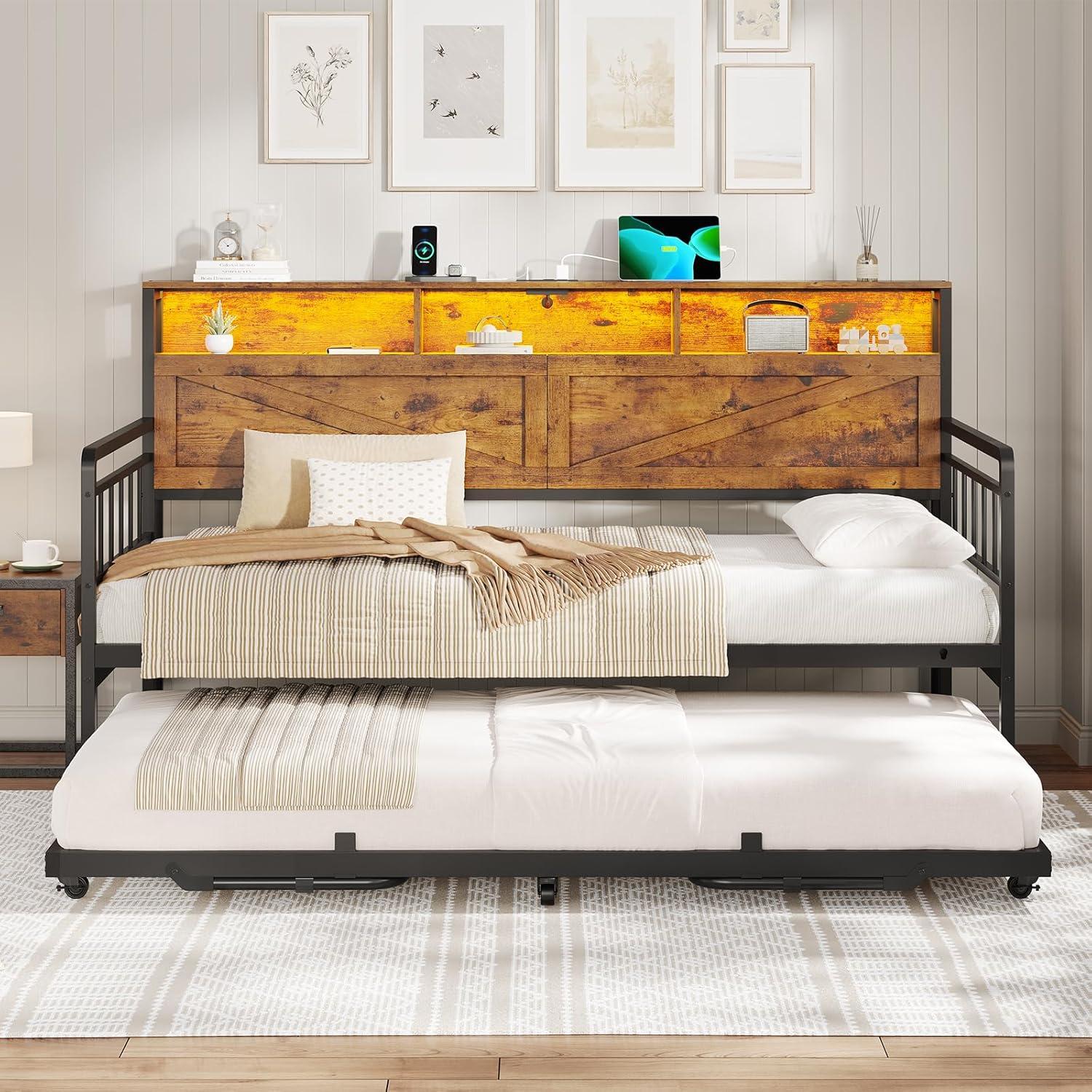 VIAGDO Daybed Twin with Pop Up Trundle, Farmhouse Wooden Day Bed Frame with 3 Storage Drawers and Shelves, Twin to King Daybed with Charging Station and LED Lights for Bedroom, Rustic Brown(Rustic Brown)