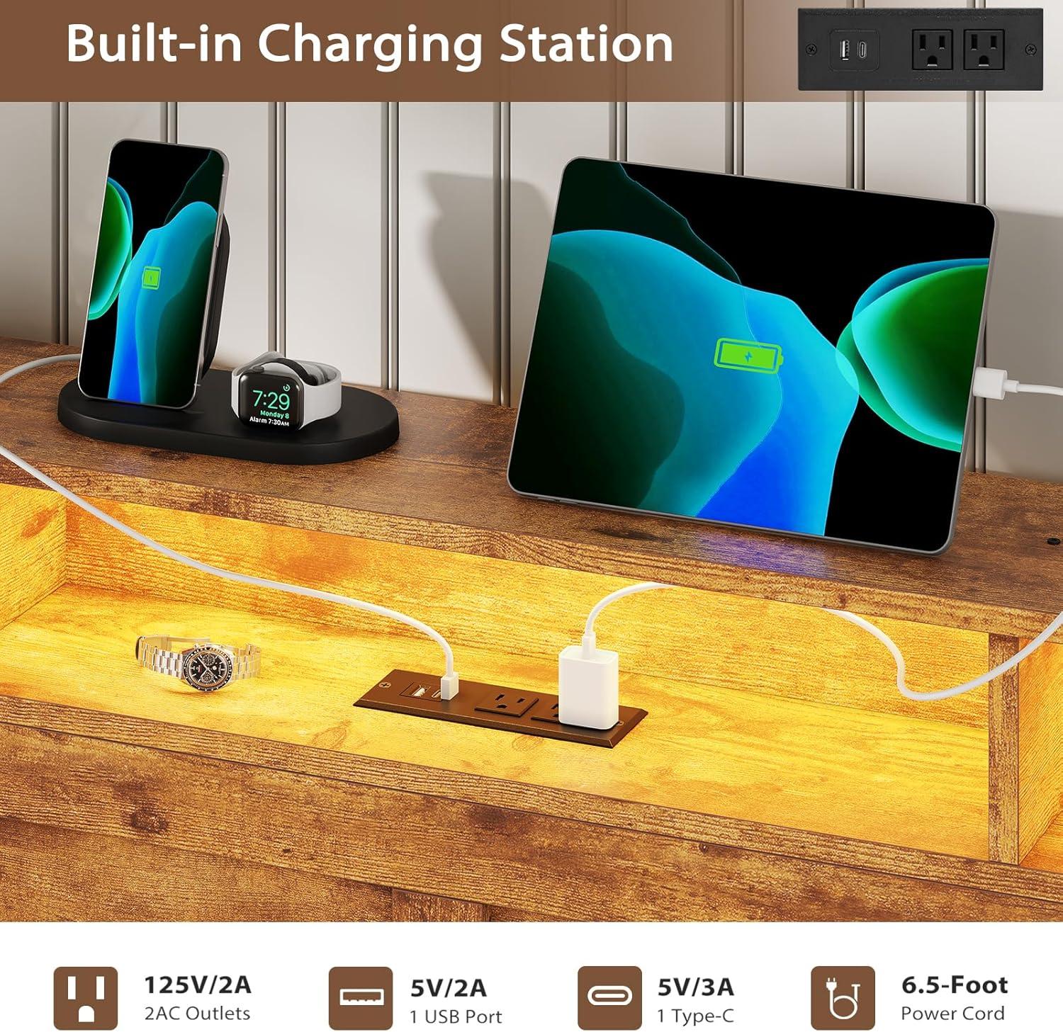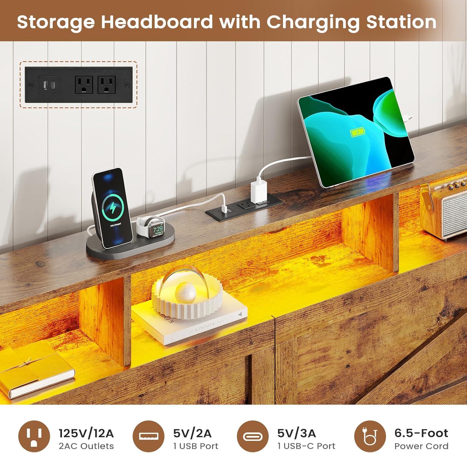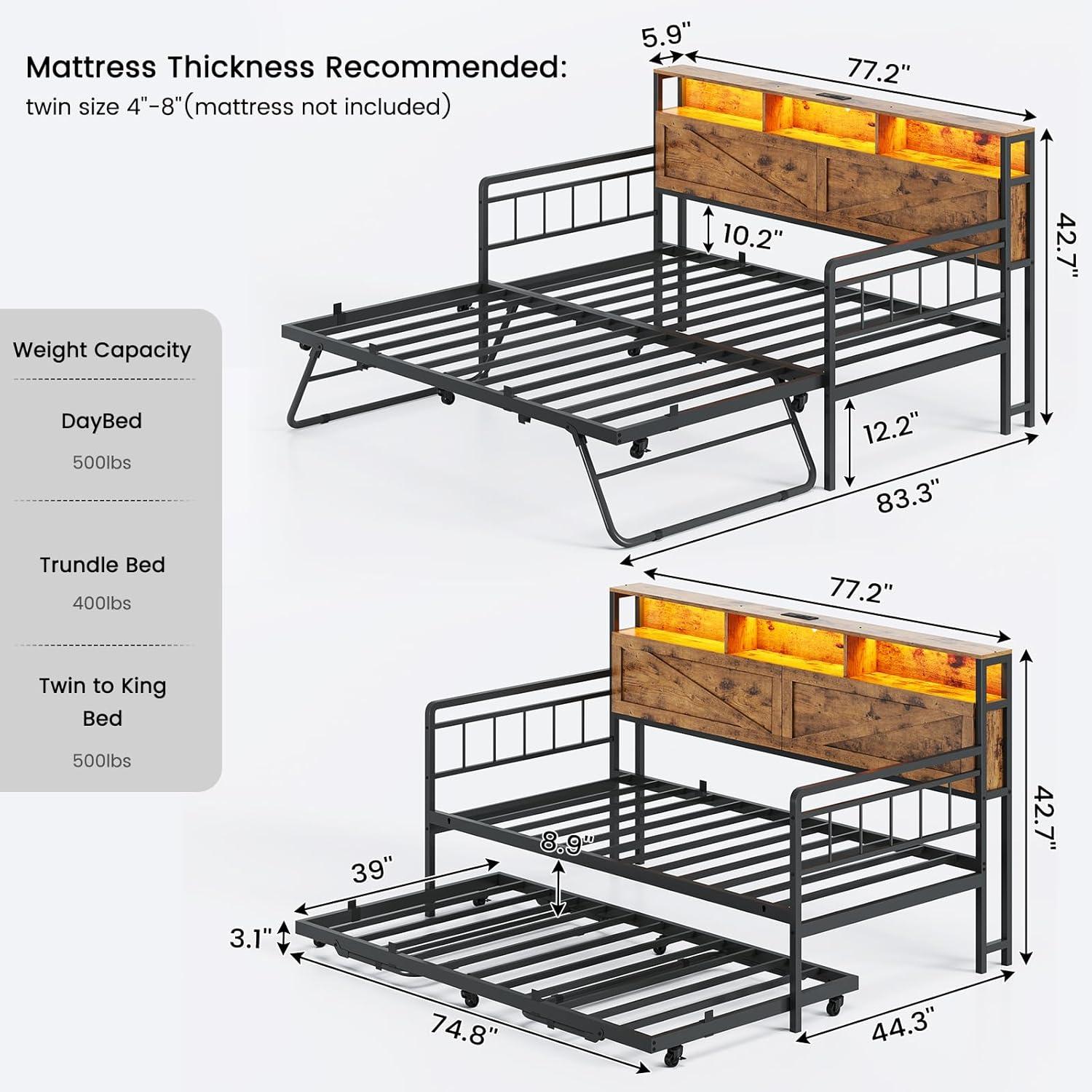 【Farmhouse Daybed with Pop Up Trundle】Maximize functionality without sacrificing style! This dual-function daybed effortlessly transitions from a cozy 3-seater sofa daybed to a spacious king daybed. The weathered wood finish and classic barn door design add authentic farmhouse character to any room. Our innovative pop up trundle mechanism instantly creates additional sleeping space, perfect for overnight guests or family movie nights. Stores completely hidden when not in use. 【Twin Daybed with 3 Drawers and Shelves】Engineered for ultimate organization with this daybed twin featuring a side storage cabinet which can be installed on the left side or right side. The storage cabinet offers a 44.3’’D x 13.8’’W computer desk enough for daily works or entertainment activities. The 3 fabric drawers measure 21.3’’D x 11.4’’W x 8.7’’H and 3-tier shelf perfectly store bedding, books, toys, or electronics, etc. The extra side storage pouch can keep small items in place. 【2-Tier Headboard with Charging Station】This day bed frame twin with bookcase headboard features a 2-tier storage shelf and five open storage cubes providing you large storage space to reach commonly used items. The embedded charging station includes 2 AC outlets, 1 USB port and 1 fast charging type-C to fully meet your charging needs. You can lounge on the daybed frame and enjoy your leisure time without looking around for power sources. The charging station meets ETL certification standards. 【Dynamic RGB LED Ambient Lighting】Let’s have some fun with the customized RGB LED daybed with trundle. Providing over 60000 fancy RGB colors, 29 dynamic modes, schedule on/off, mic and timing function, dual control by remote or phone APP. It can be used as a nightlight to cast away darkness or a dynamic lighting show for home concert or pajama party.