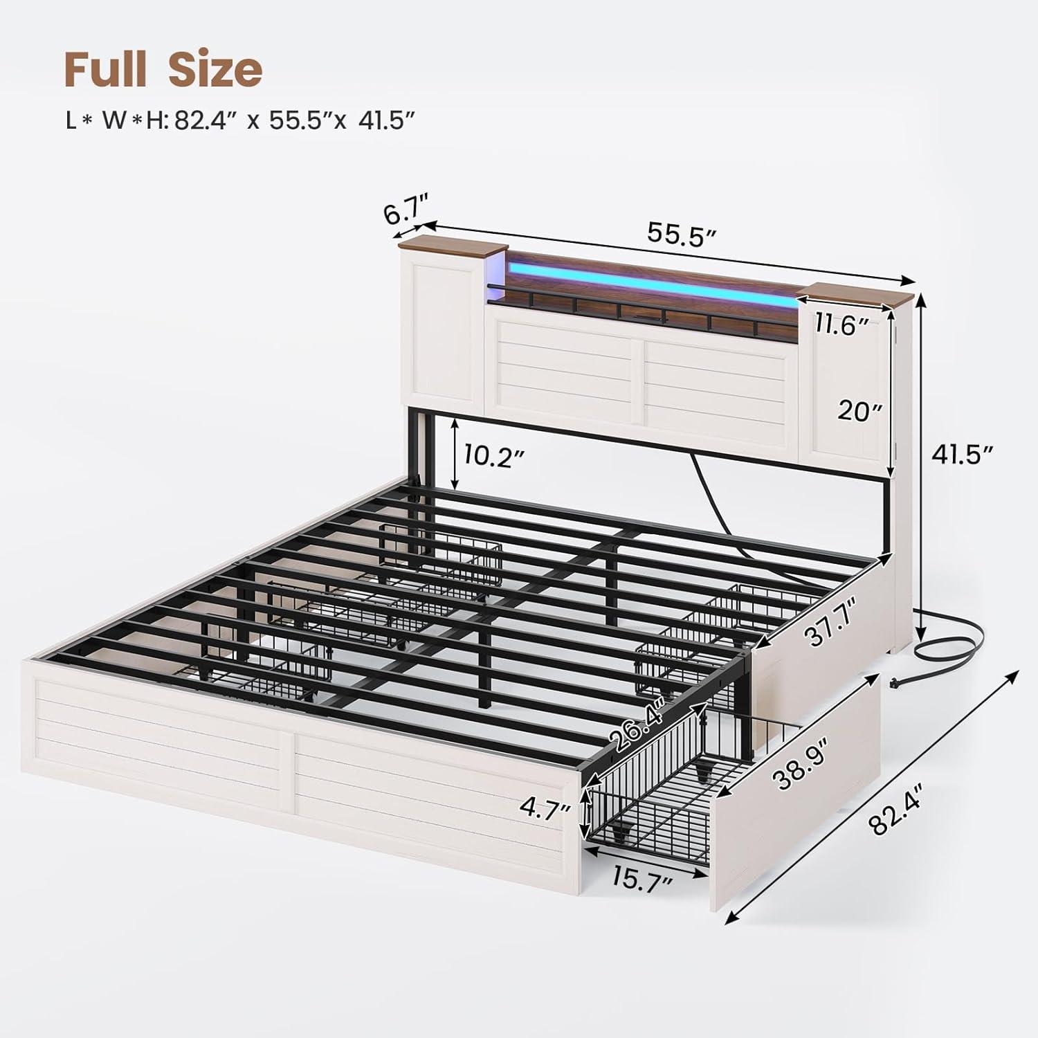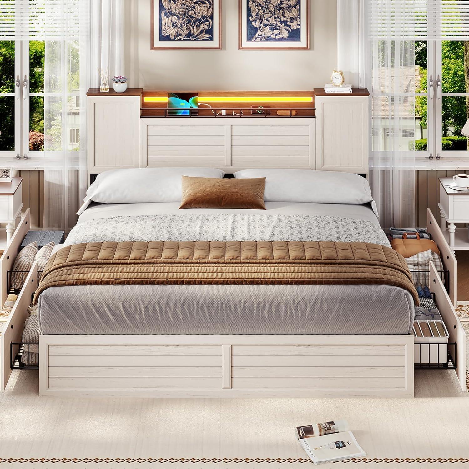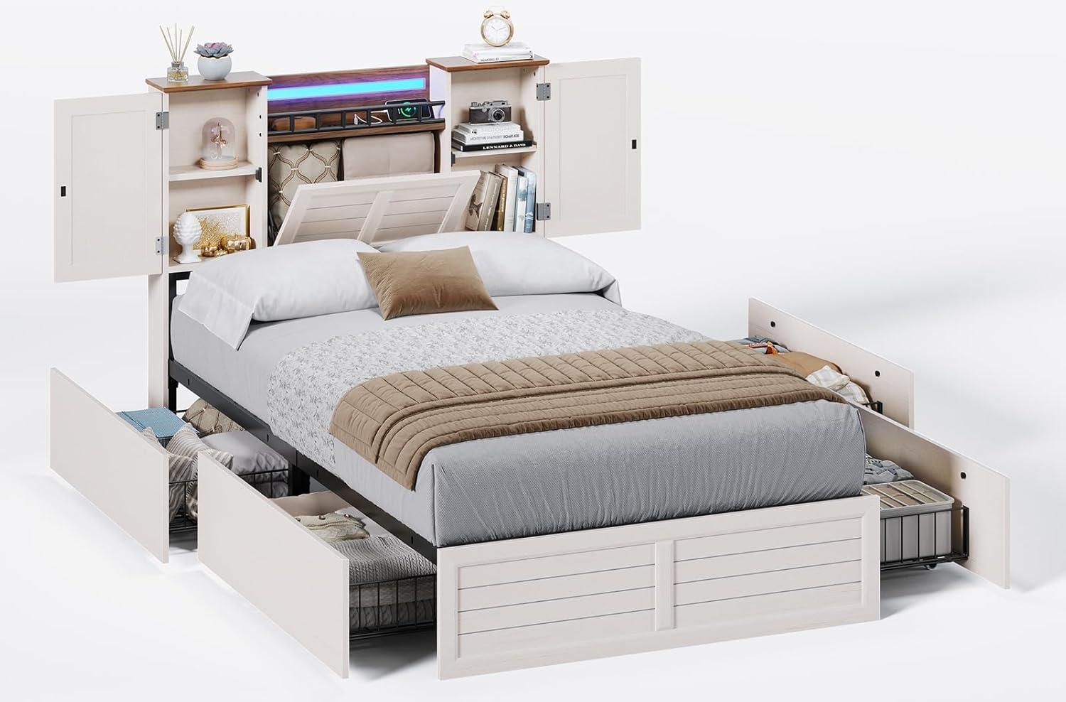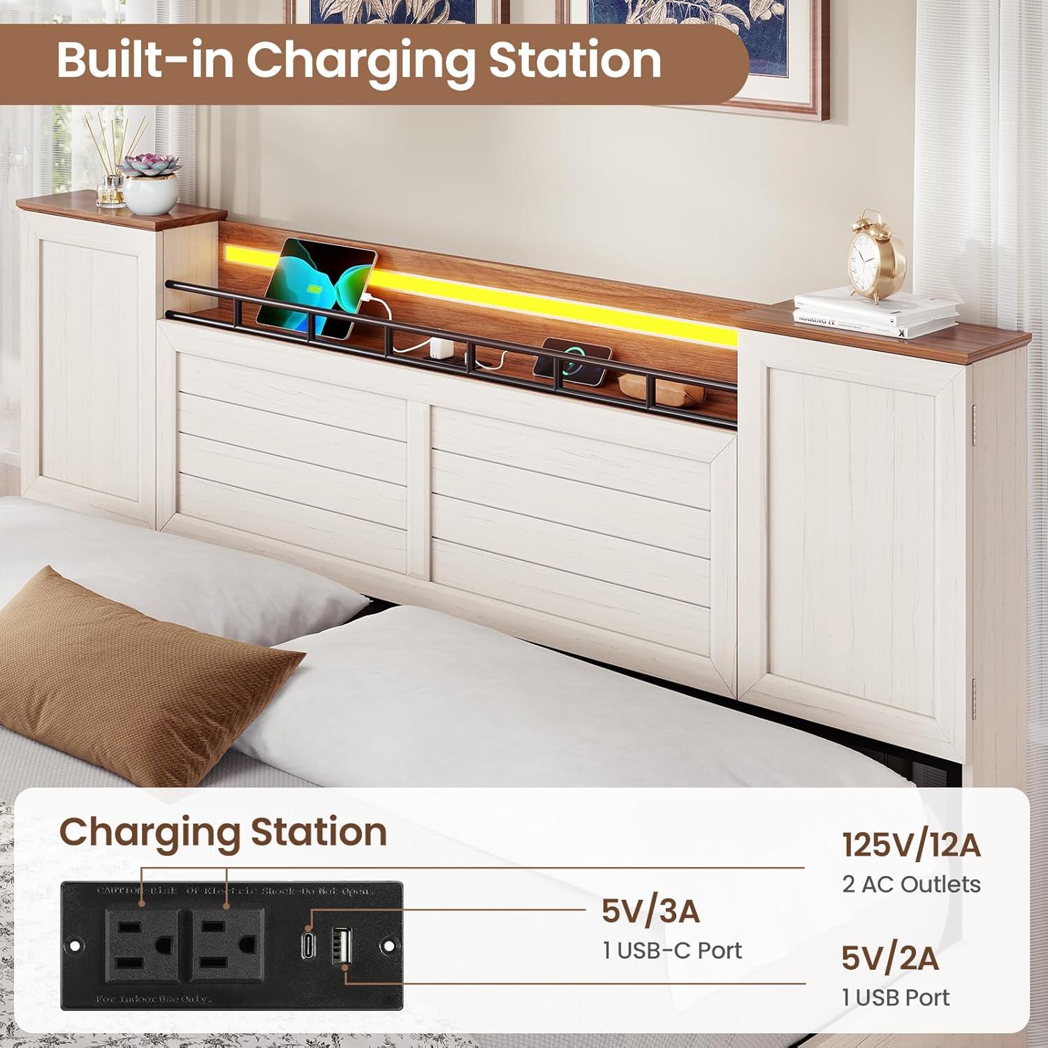 【Utility Storage Headboard】Unlock unparalleled organization with smartly divided compartments designed for every need. The queen size bed frames with headboard features a hidden storage zone, ideal for stashing nighttime essentials. While the dual side cabinets offer adjustable shelving system, you can adjust the height of the interior rack to accommodate tall items or compact accessories. And the open shelf with metal bars can store often-used items within hand’s reach and prevent falling.