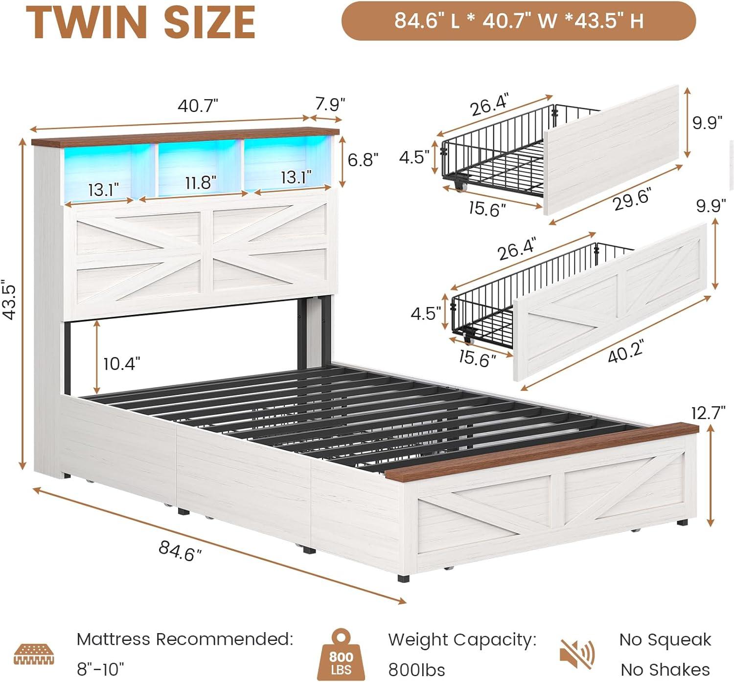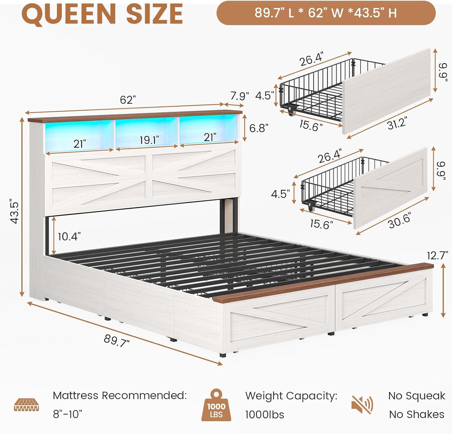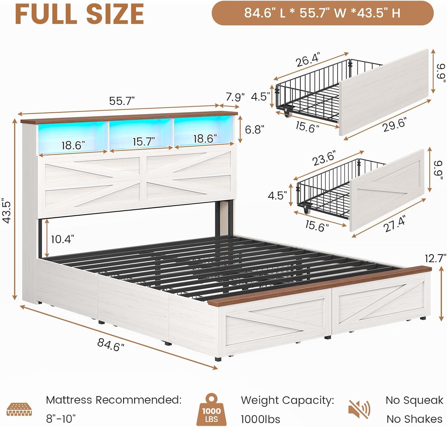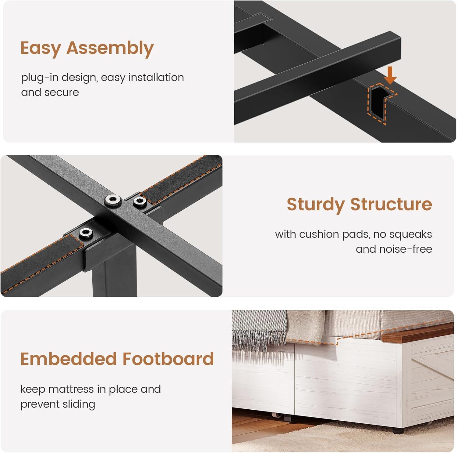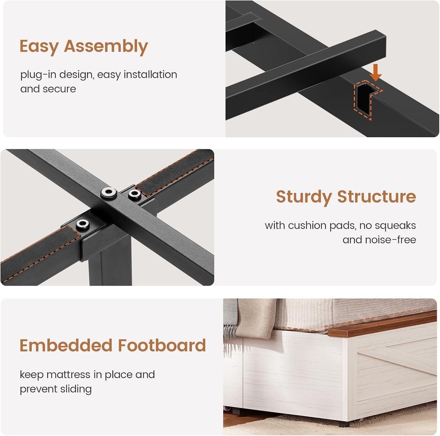 【Built to Last】The full size bed frame with drawers combines a strengthened metal frame with FSC-certified wood panels, supporting up to 1000 lbs with no box spring needed. Assembly is quick and tool-free thanks to the intuitive snap-on design, while noise-dampening felt strips on all metal contact points ensure a peaceful and scratch-free experience.