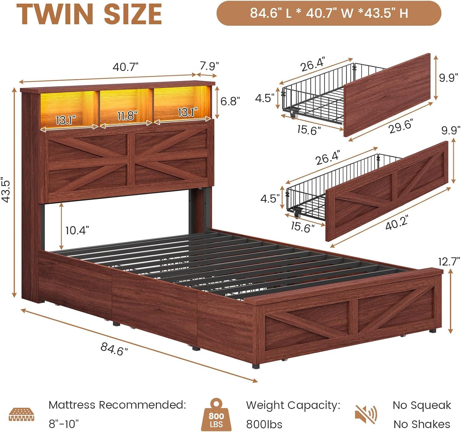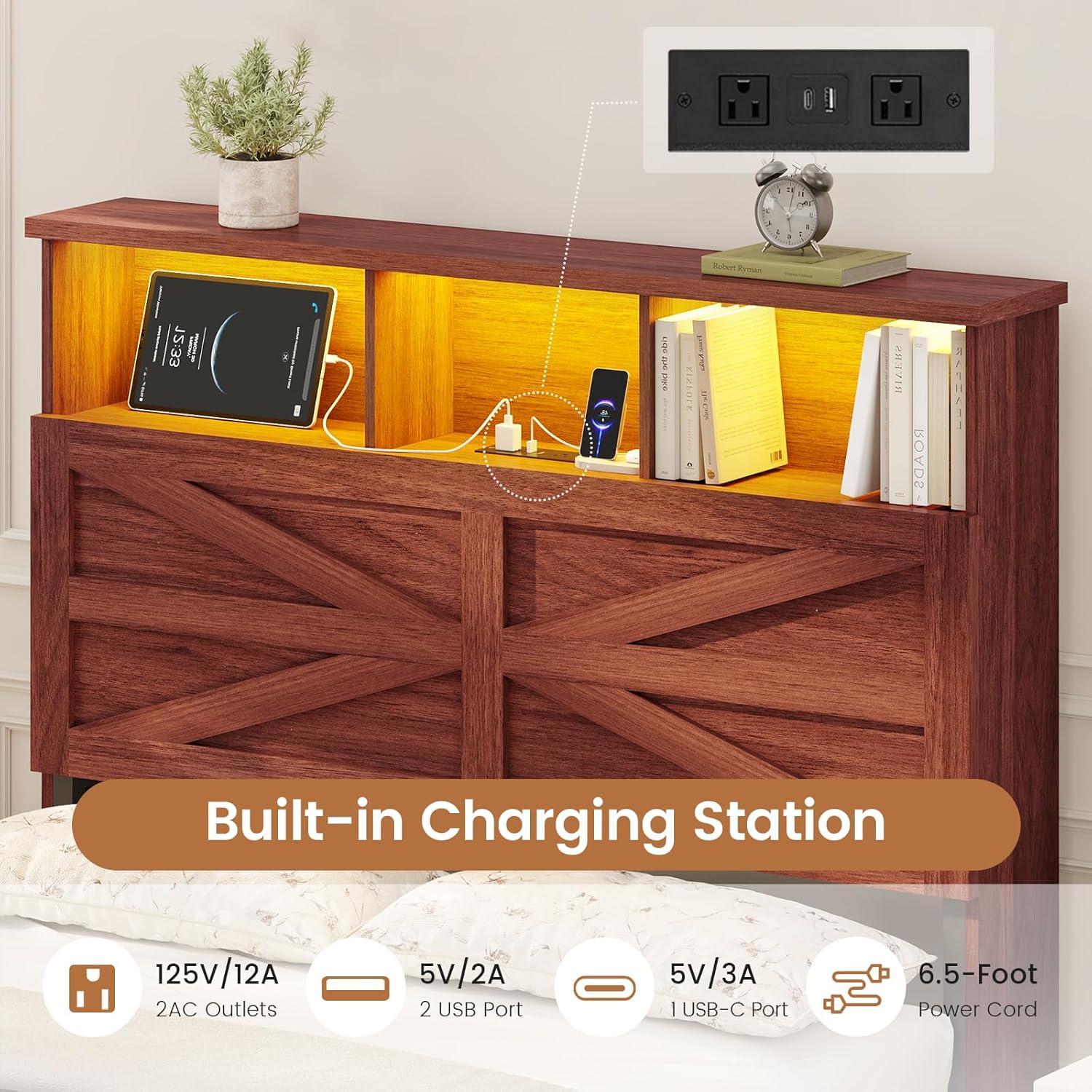VIAGDO Full Size Bed Frame with 6 Drawers, Farmhouse Bed Frame with Barn Door Headboard and Storage, Wood Platform Bed Frame Full Size with Charging Station and LED Lights, No Box Spring Needed, Brown(Brown)