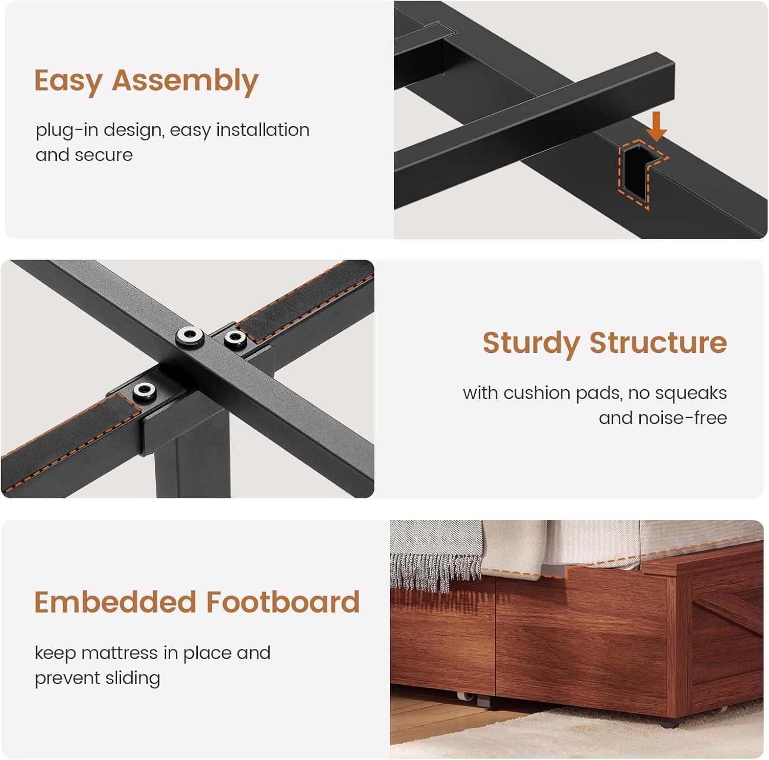 【Built to Last】The full size bed frame with drawers combines a strengthened metal frame with FSC-certified wood panels, supporting up to 1000 lbs with no box spring needed. Assembly is quick and tool-free thanks to the intuitive snap-on design, while noise-dampening felt strips on all metal contact points ensure a peaceful and scratch-free experience.