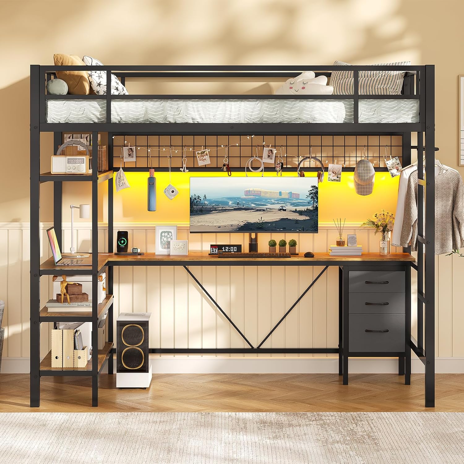 【Practical Space Saving Design】The twin bed frames with storage comes with a 40.5’’x11.8’’ 4-tier bookshelf, a 76.6’’x14.6’’ L-shaped desk, and a 3-tier metal shelf with 3 fabric drawers to place your books, files, home printer, or other items. The decorative metal mesh plus 10 hooks can create a fancy photo collection, or simply use it as extra supplement for hanging small items. There’s also a clothes hanging rail providing a convenience spot to hang up the hangers, scarves, or clothes.