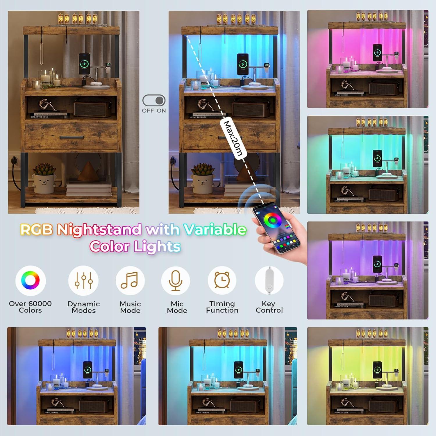 【Adjustable RGB LED Nightstand】This rustic brown nightstand is equipped with a multi variable RGB lighting system that can be connected to an APP for easy adjustment of tens of thousands of colors, brightness levels, change speeds, and dynamic modes. It also features music rhythm sync and timing functions. The modern LED nightstand can create a captivating atmosphere and effectively enhance the emotional appeal of the space.