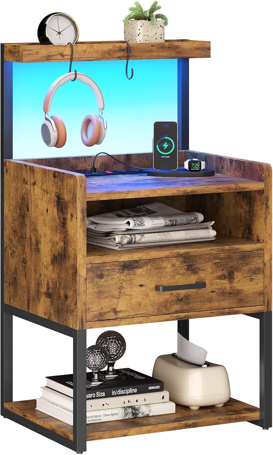 VIAGDO Nightstand with Charging Station and LED Lights, Rustic Brown Night Stand with Drawer and Open Storage Shelves, End Side Table with USB Ports and Outlets, Bedside Tables for Bedroom, Officee