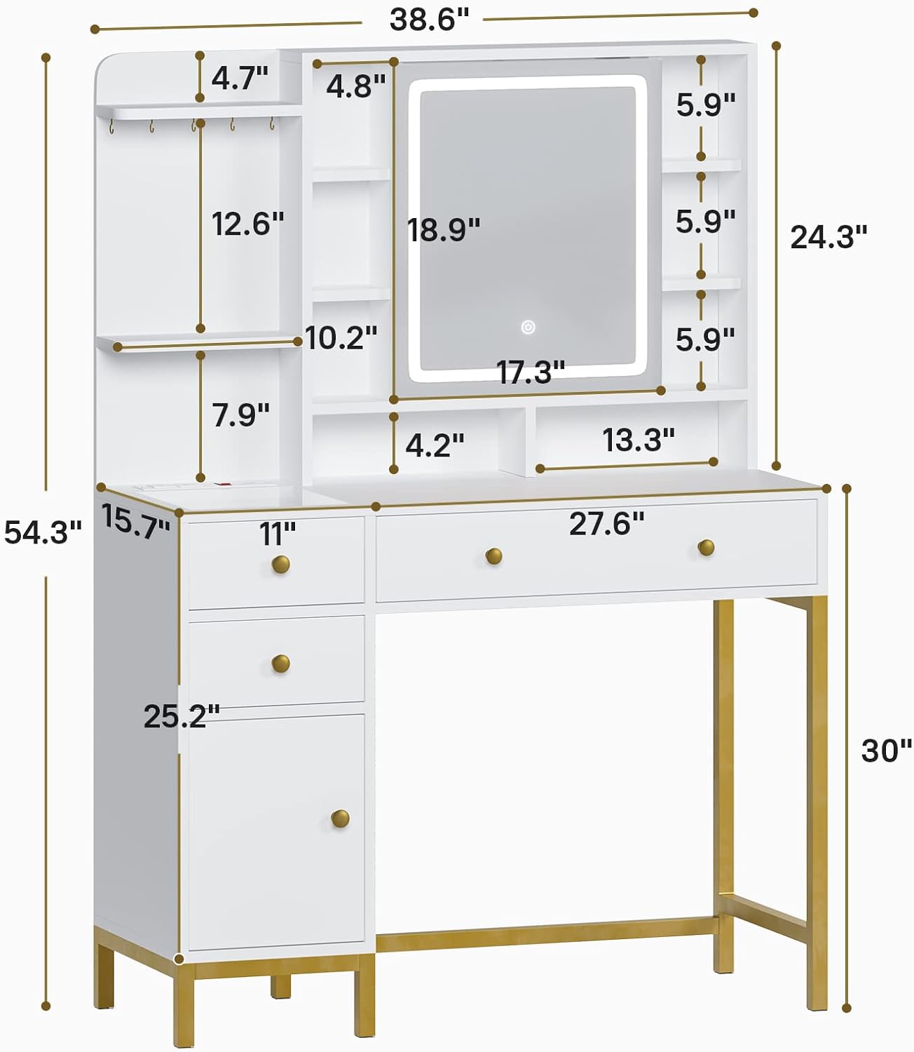 【Durable Material and Easy to Assemble】This makeup vanity with light is made of particle board, golden iron pipe at the bottom, which has strong anti-rust ability and support, making the vanity desk have a long service life. The vanity table(38.6 “L x 15.7″W x 54.3″H) comes with detailed instructions and tools, it is recommended to follow the steps in the included instructions, and then arrange each board according to the number, and finally assemble, which can save time.