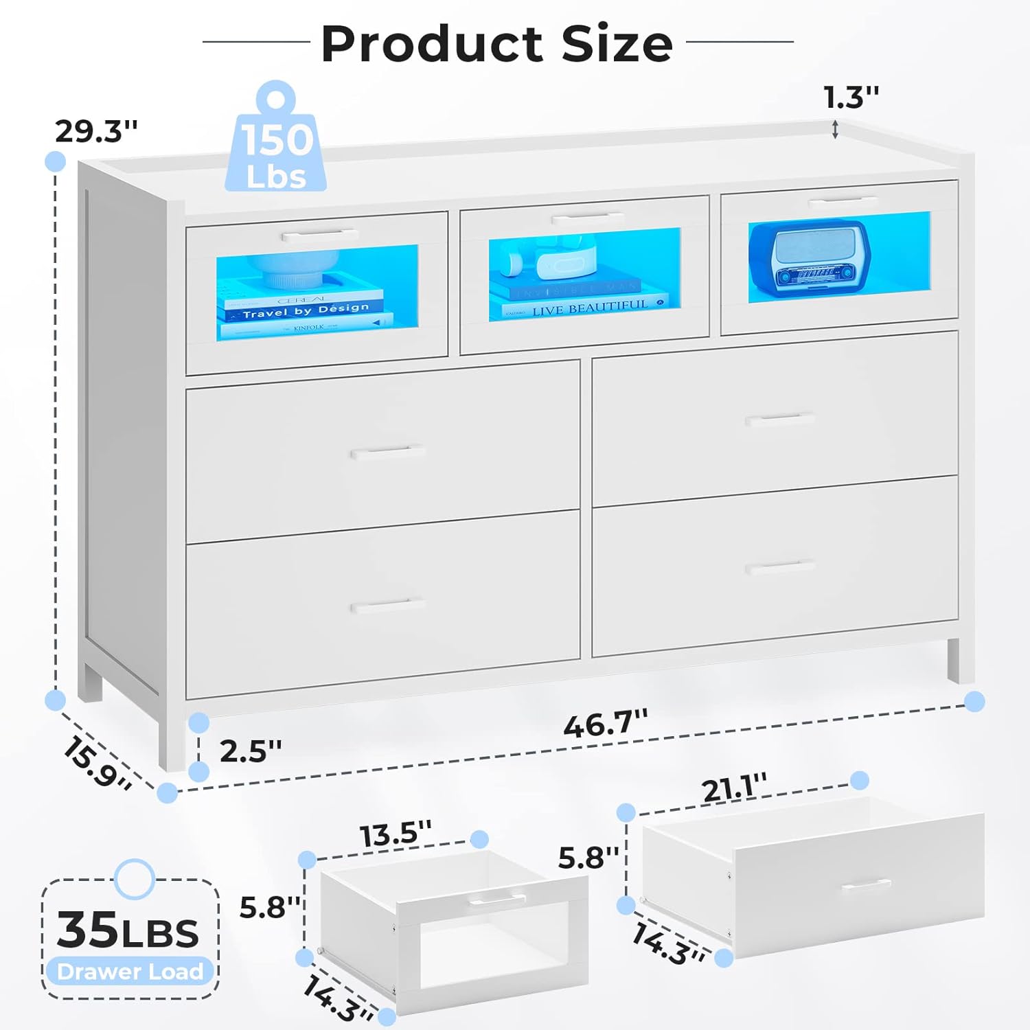 【7 Drawer Dresser with LED Lights】This white dresser with 7 drawers is designed with multi-variable RGB lights, which can be changed to various modes and adjust the brightness of the lights through buttons or mobile APP. In addition, after connecting to Bluetooth, the LED light strip can freely switch colors according to the rhythm of the music. LED dresser can add ambiance to dark spaces.